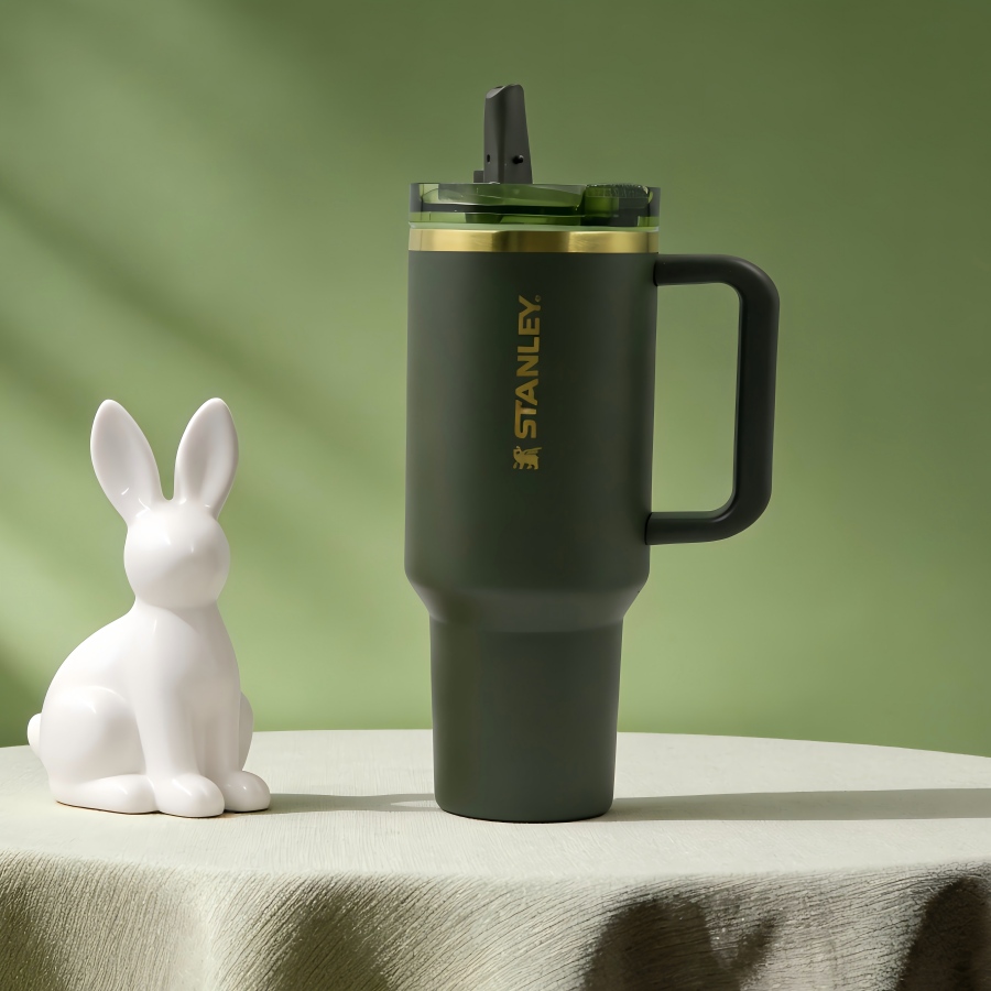 Stanley Tumbler Cup 40oz, Premium Insulated Water Bottle, Dark Forest Green Gold Rim, Gift for Women Men